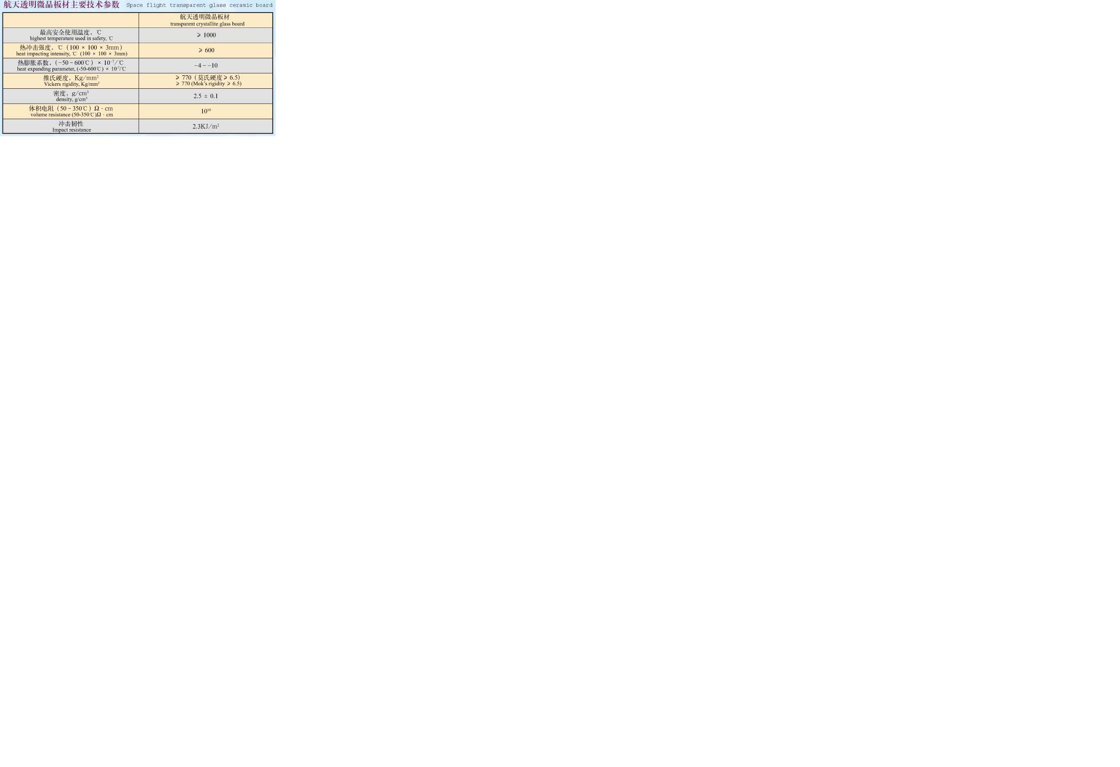 透明微晶是利用玻璃均質析晶理論,鋰化物為晶核劑,以納米及晶核框架,由玻璃做填充物的一種復相材料,熱膨脹系數低,化學穩定性高,抗熱沖擊強。該產品特點是,熱不漲,冷不縮,耐寒零下百度低溫、零上千度高溫而不動聲色,具有透光透視特性,是航空、航天、電子熱工、防火建筑等領域不可多得的新型材料,廣泛用于壁爐、烤箱、電磁爐、電陶爐、光波爐等家用電器。被北京航天三院用于激光陀螺加工設備。這是我集團航天微晶產品應用在國防領域應用,打破一直進口的歷史。